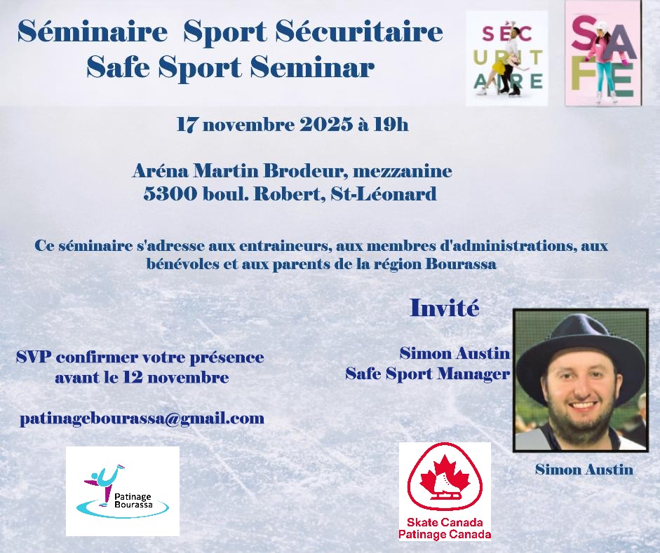 Rejoignez nous le 17 novembre 2025 à 19h00 pour une formation en Sport Sécuritaire! Cette formation est ouverte à tout les intervenants du patin: entraîneurs, parents, bénévoles, officiels, marraines, gérantes, membres des conseils d’administration, etc.! Envoyez un courriel à patinagebourassa@gmail.com pour vous inscrire!